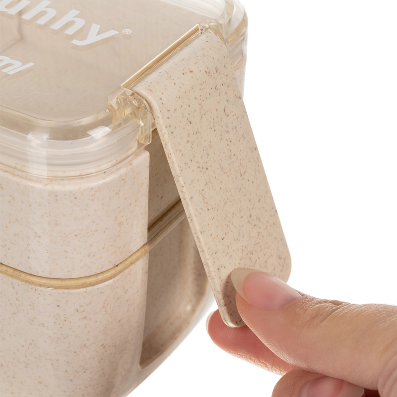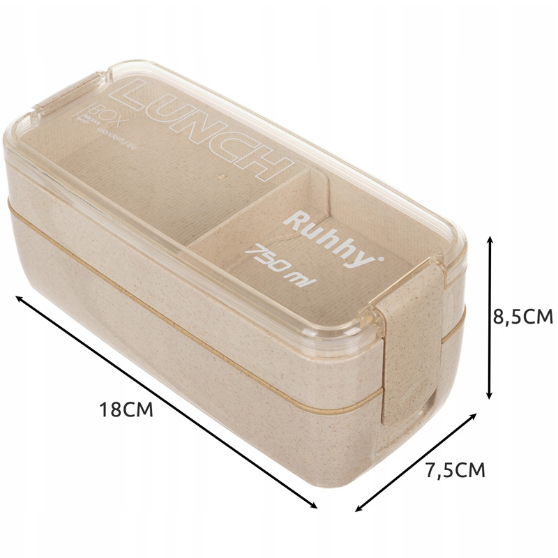 Obsahuje dve samostatné priehradky s objemom 400 ml a 350 ml, ktoré udržia jedlá oddelené bez miešania chutí. Dodatočný vyberateľný oddeľovač umožňuje priestor rozdeliť na menšie časti, napríklad na zeleninu či ovocie. Veko obsahuje tesnenie, ktoré zaisťuje bezpečné uzavretie a zabraňuje pretekaniu jedál počas prenosu.