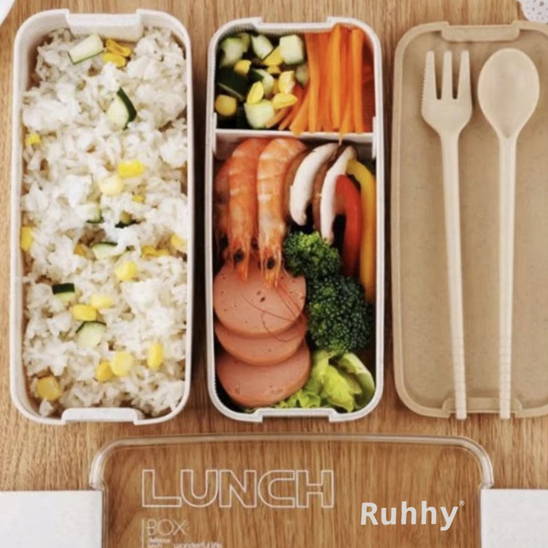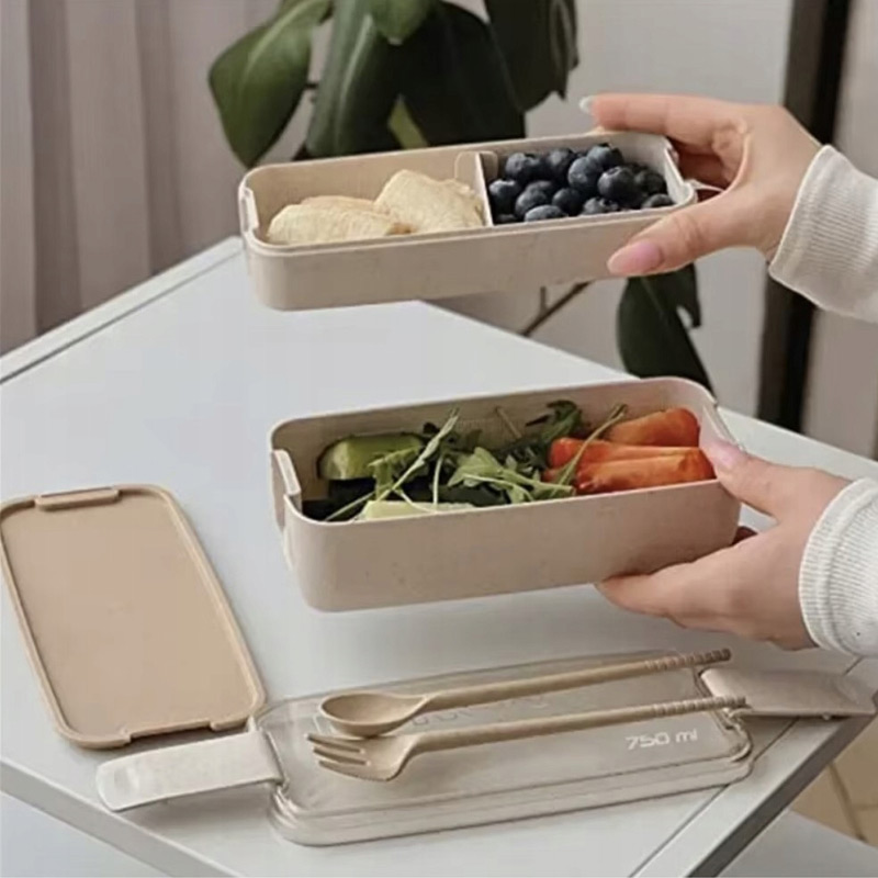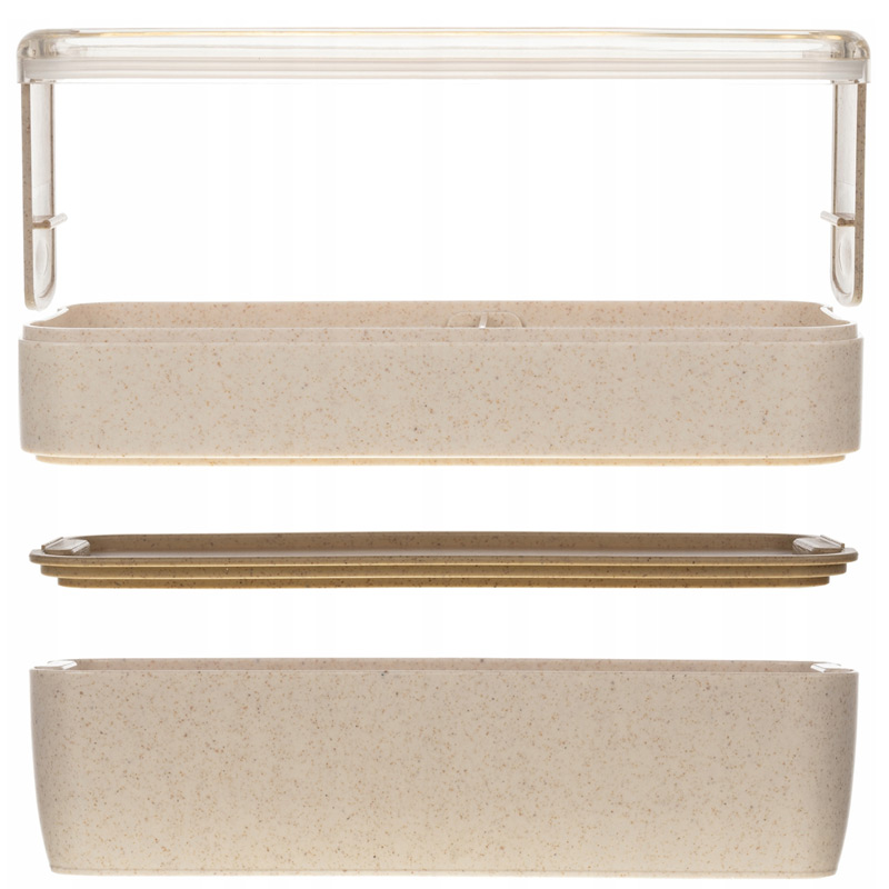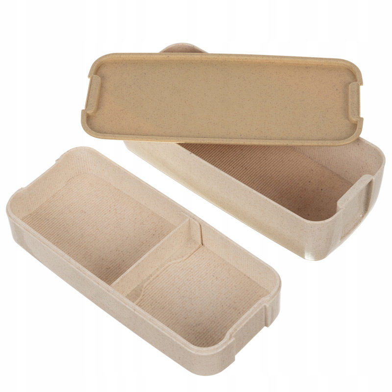 Box na desiatu z ekologických materiálov s dvoma priehradkami, oddeľovačom a praktickým príborom zo pšeničnej slamy.